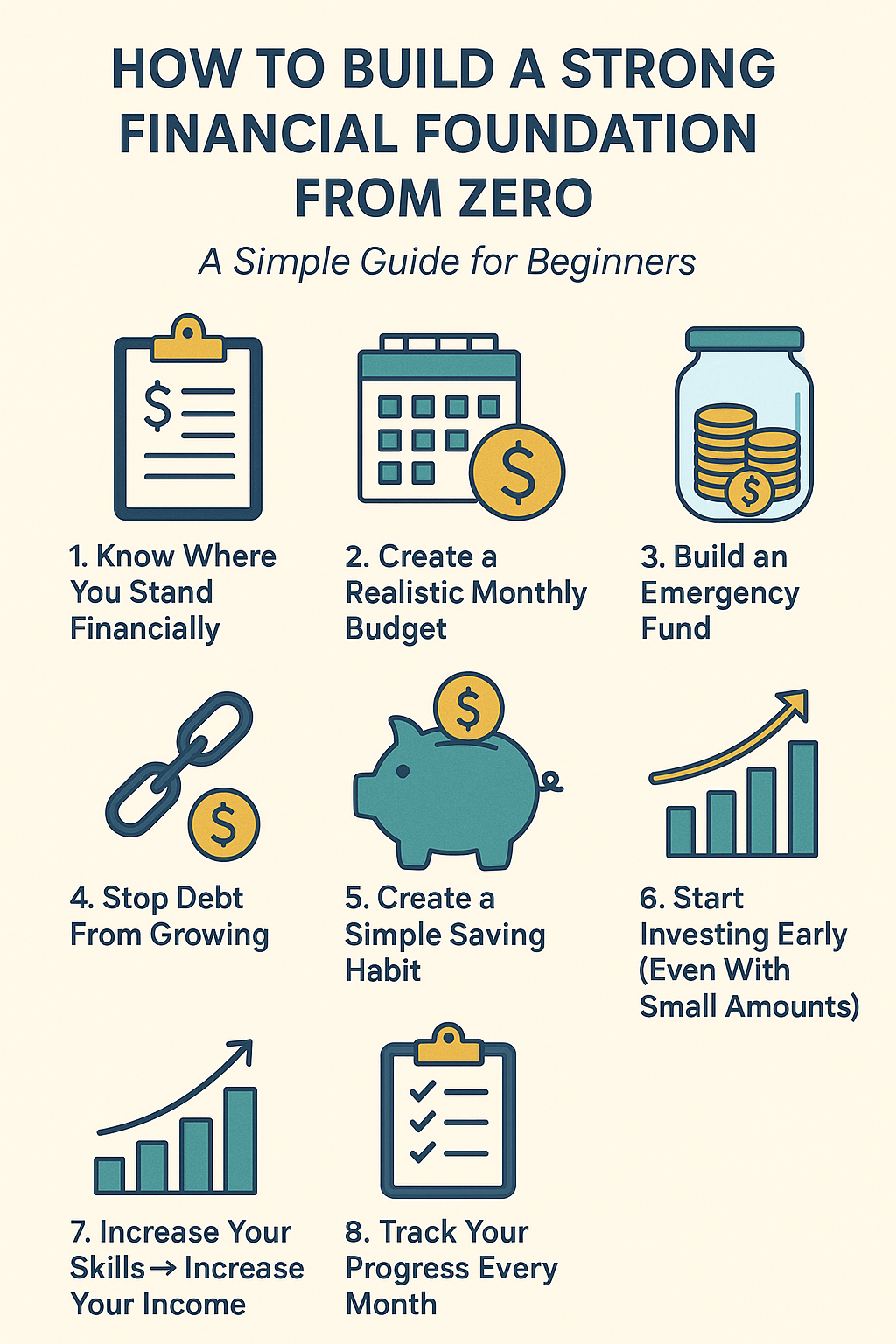 Building a strong financial foundation doesn’t require being rich — it starts with simple habits, discipline, and understanding how money works. Whether you’re starting from zero or even from debt, the steps below will help you create a stable financial future.