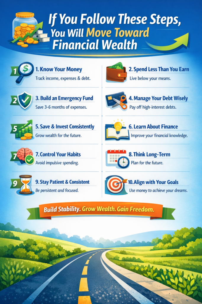This article explains, in clear and practical terms, the steps that help everyday people move toward financial wealth. These steps are not shortcuts. They are proven principles that work across countries, cultures, and income levels.